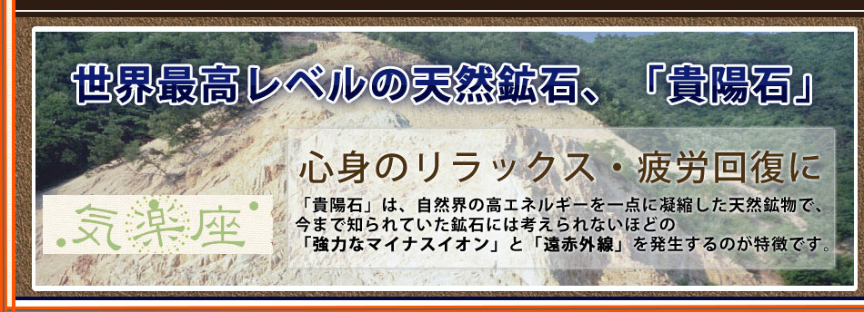- 群馬長石御座入鉱山でのみ採れる自然界最高レベルの健康天然鉱石「貴陽石」を取り扱っています。「貴陽石」は、約6500万年前の地殻変動にともなう高温熱水作用によって形成された鉱山に埋蔵しています。自然界のエネルギーを一点に凝縮した特殊鉱物であり、これまでの鉱石には考えられない「強力なマイナスイオン」と「遠赤外線」を発生させます。21世紀の健康素材として必須の天然石です。肩こり解消グッズの取り扱いもあります。
